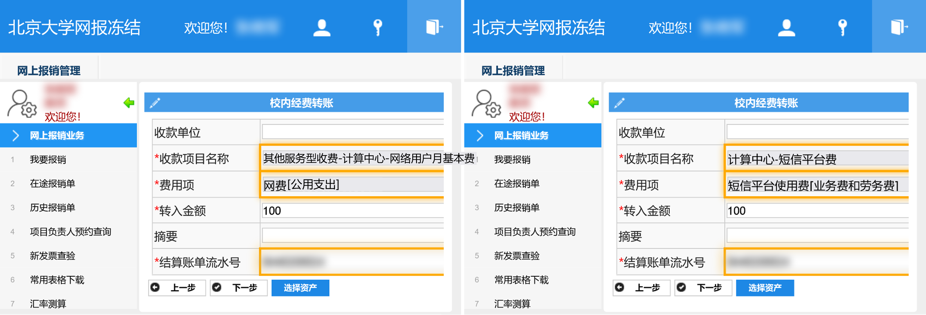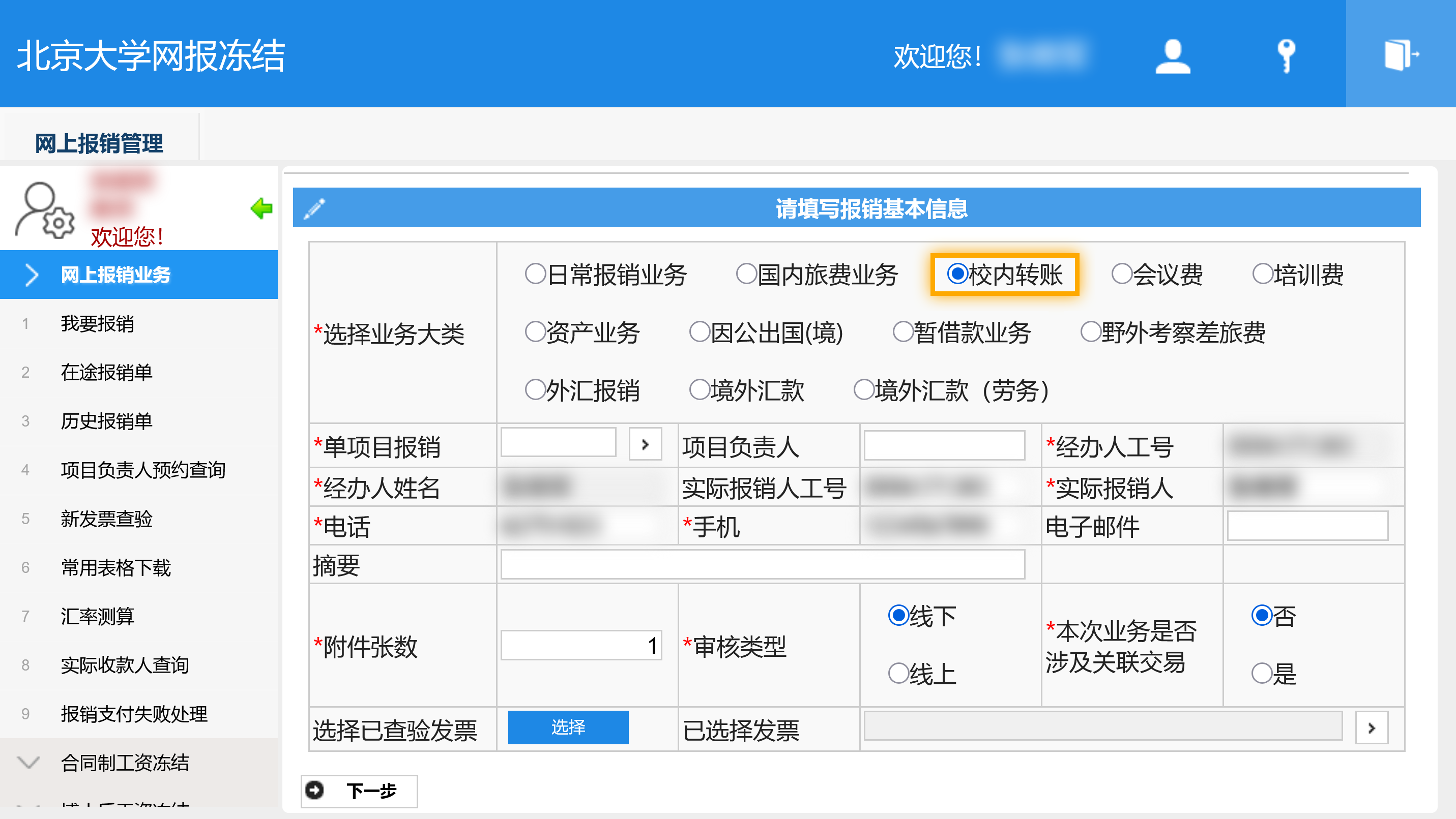 1. 登录财务部综合信息门户(https://cwfw.pku.edu.cn),通过“网报冻结“模块填写预约报销单(以下简称预约单),业务大类选择”校内转账“。如果选择财务系统线上审核,需将线上所有审核(包括项目负责人和单位公章审批人)手续办理完才能提交缴纳网费申请。