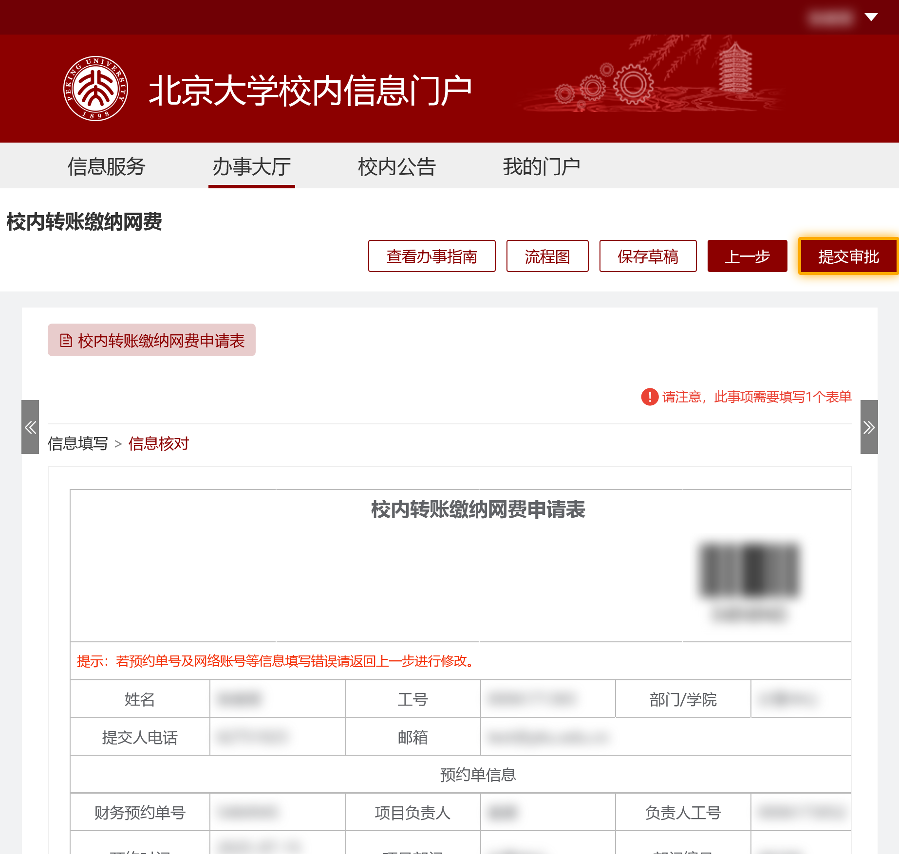 3. 登录北京大学校内信息门户(https://portal.pku.edu.cn),在办事大厅中寻找“校内转账缴纳网费”,或者直接搜索“校内转账”,点击进入校内转账缴纳网费业务流程。