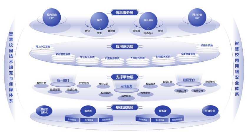 计算中心紧密结合北京大学自身需求,通过整体规划、分步实施,自主研发完成了学生、人事、财务、科研、资产、办公等一系列综合信息管理系统,同时依托统一身份认证、校内信息门户、数据共享平台等多个综合服务平台,共同构建起北京大学数智化校务的完整体系。