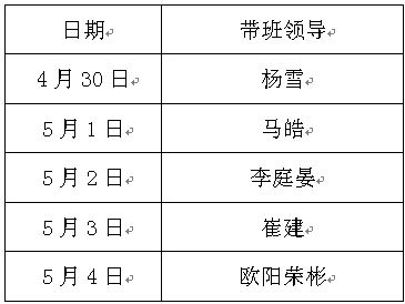 根据上级有关文件要求和学校《关于2018年部分节假日安排的通知》(校办〔2018〕2号),结合计算中心实际情况,为确保劳动节放假和校庆期间学校管理服务工作正常有效运行,现就近期带值班工作安排如下: