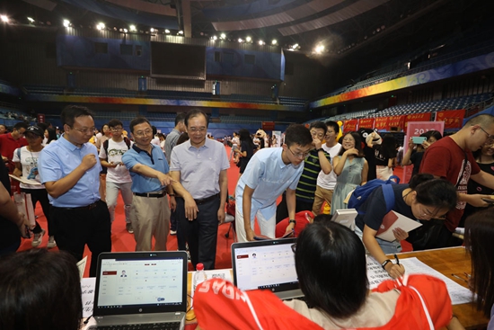 迎新过程中,党委书记郝平和校长林建华在计算中心主任张蓓的引导下,亲自体验了“刷脸报到”技术为迎新工作带来的崭新变化,实时了解了各院系学生报到的进展情况,并对计算中心积极将前沿技术应用于迎新工作的努力和实践给予了高度评价。郝平还特别指出,计算中心今年开展的一系列“刷脸”应用工作得到了北京市教工委领导的高度肯定和表扬。主管校领导、党委副书记安钰峰则亲切鼓励计算中心再接再厉,取得更多突破和成绩,让师生获得更好的服务。