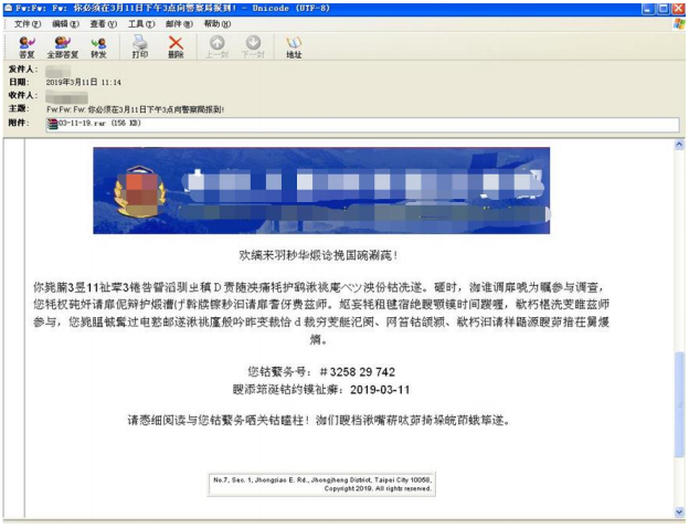 此类病毒邮件主题包含威慑性的字眼,如“警察局”“必须”等字眼,正文一般显示乱码内容,主要恐吓收信人点击病毒附件已达到目的。比如,主题是“你必须在3月11日下午3点向警察局报到!”;正文显示乱码;附件名为“03-11-19.rar”以下为部分病毒邮件截图: