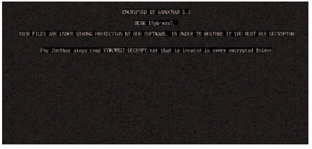 GANDCRAB V5.2 勒索病毒加密后的文件扩展名为随机字符,其不仅加密本机文件,还会加密 局域网共享目录中的文件,加密完成后会修改被感染机器桌面壁纸,进一步提示用户勒索信息。