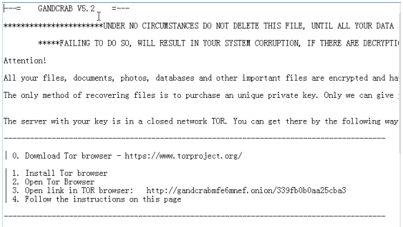 近日,各大安全中心侦测到有一种新型的病毒邮件正在呈现扩散趋势。经分析研判,该勒索病毒版本号为GANDCRABV5.2,是2019年2月最新升级的勒索病毒版本,运行后将对用户主机硬盘数据全盘加密,并让受害用户访问网址“https://www.torproject.org/”下载Tor浏览器,随后通过Tor浏览器登录攻击者的数字货币支付窗口http://gandcrabmfe6mnef.onion/1812a265c3857fa,要求受害用户缴纳赎金。
