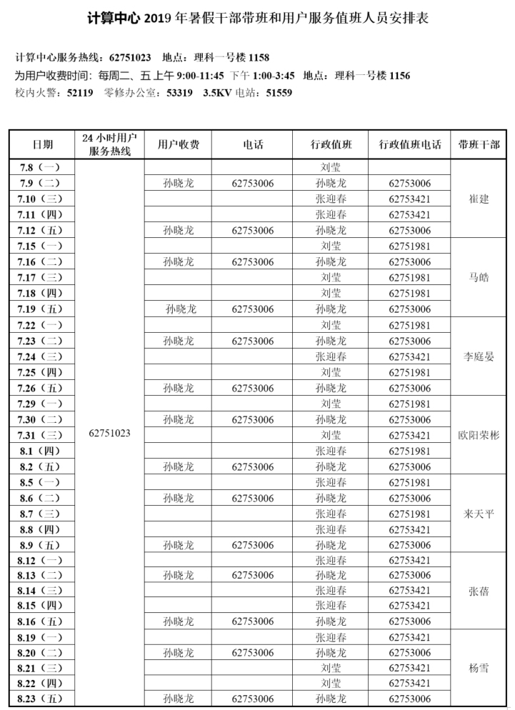 计算中心2019年暑假值班表