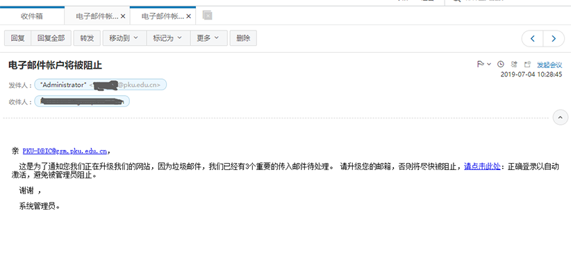 请注意,此类钓鱼邮件的发信人名称通常是Administrator或者“北京大学邮件系统”、“北京大学计算中心”,但细看发信地址却不是@pku.edu.cn的,或者只是某个@pku.edu.cn个人用户的邮件地址。这种名称与发信地址不符的,通常都是垃圾邮件或者钓鱼邮件。