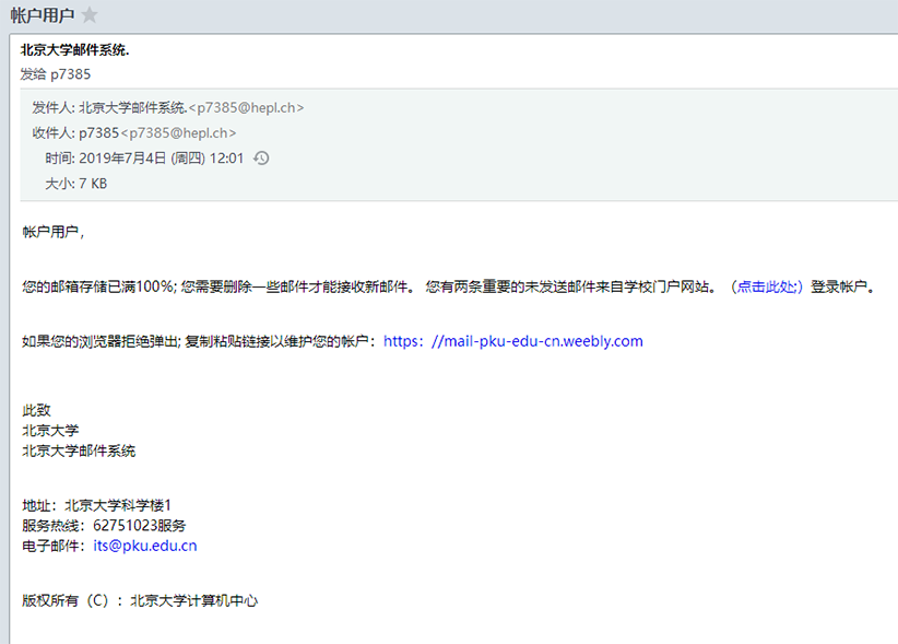 关于邮件系统的任何升级维护,计算中心都会在网络服务(https://its.pku.edu.cn)首页发布相应的通知信息,绝对不会仅仅以邮件形式通知用户点击链接升级邮箱,任何关于升级、扩容的邮件通知都是钓鱼邮件。