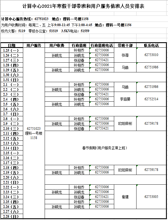 计算中心2021年寒假值班表