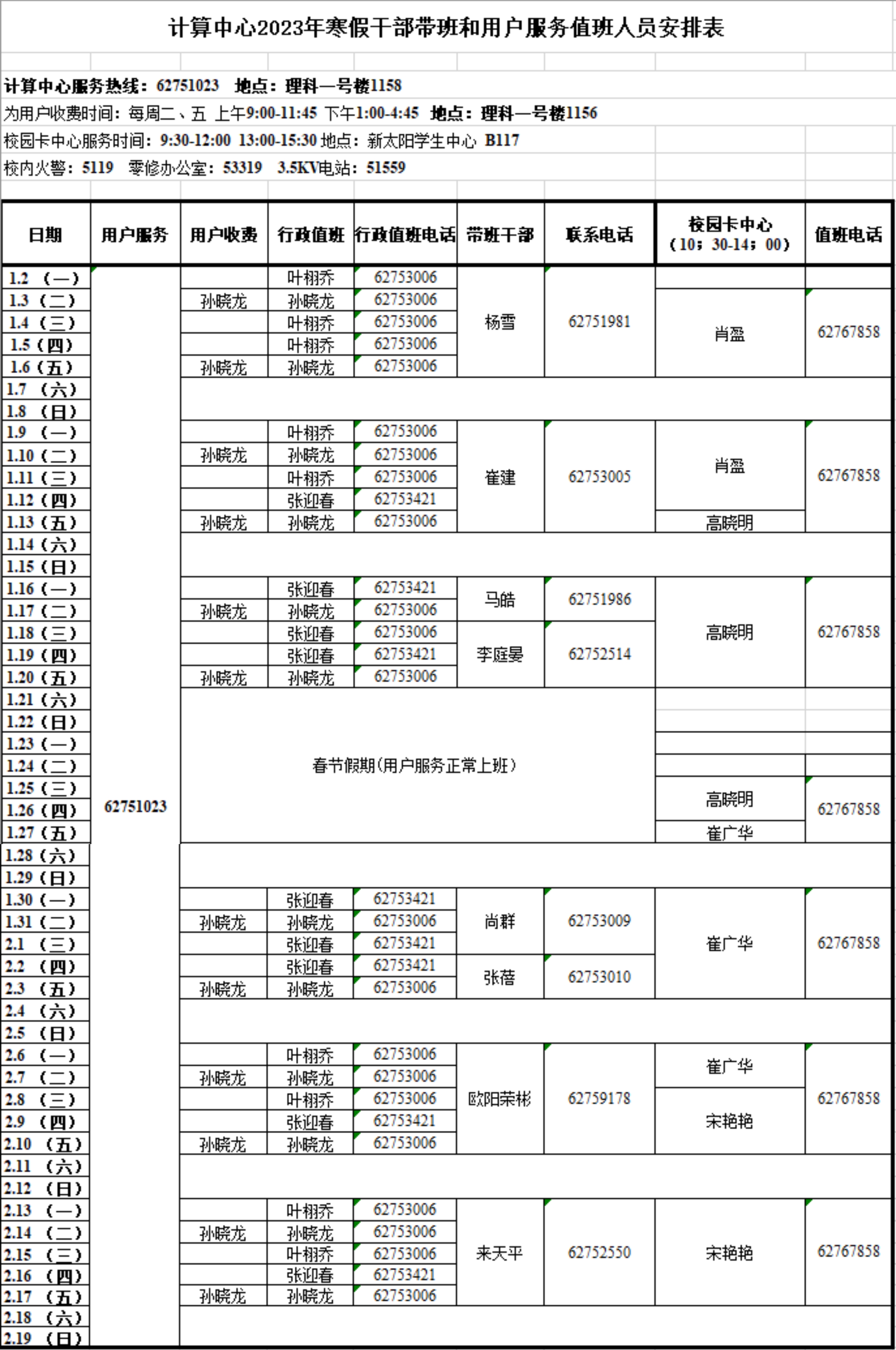 计算中心2023年寒假干部带班和用户服务值班人员安排表