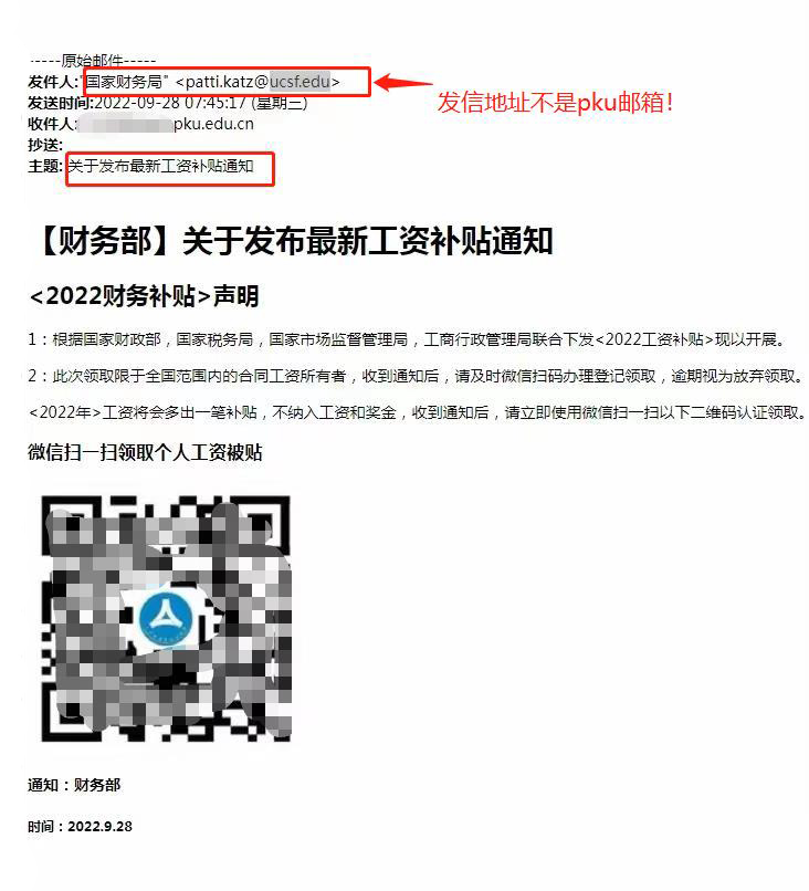 钓鱼邮件变种繁多,请大家收到邮件后一定要注意发信人的地址,学校发送的通知都是@pku.edu.cn结尾的,不会使用校外邮件地址。如果不能确定真伪,具体操作之前与相关单位核实一下。
