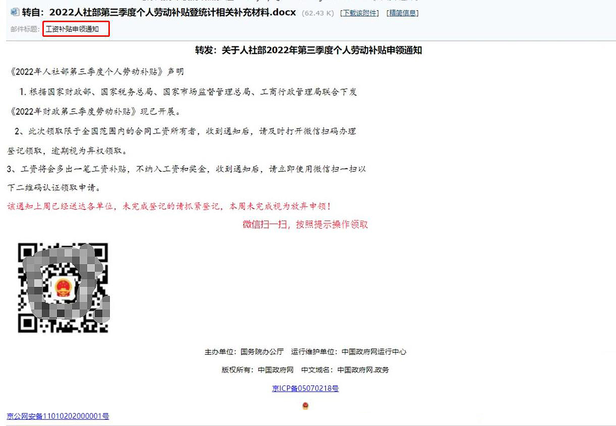 近期经过网络监测和用户报告,我们发现有伪冒我校管理部门群发钓鱼邮件的情况,常见的标题是:“关于发布最新工资补贴通知”、“工资补贴申领通知”,附件名称类似“转发:2022人社部第三季度个人劳动补贴等统计相关补充材料.docx”。请全校师生注意防范。